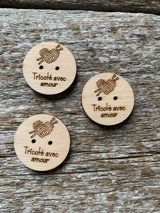 Bouton de bois « Tricoté avec amour » et coeur balle de laine