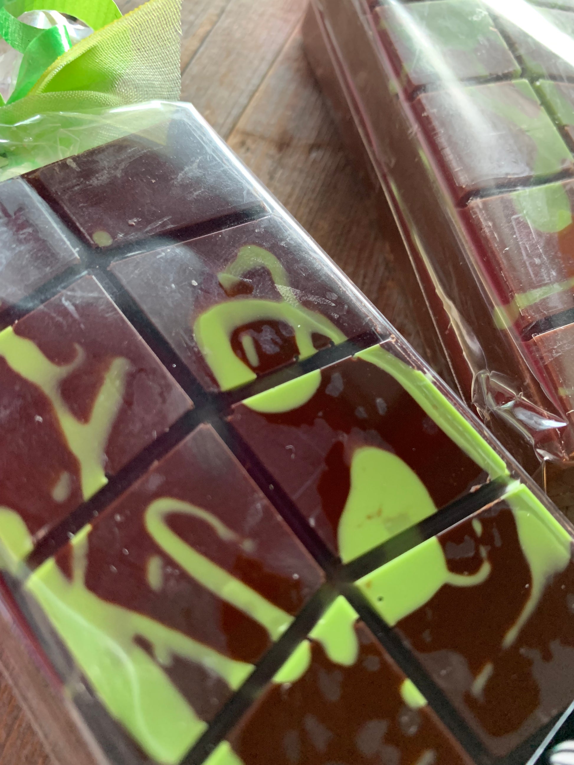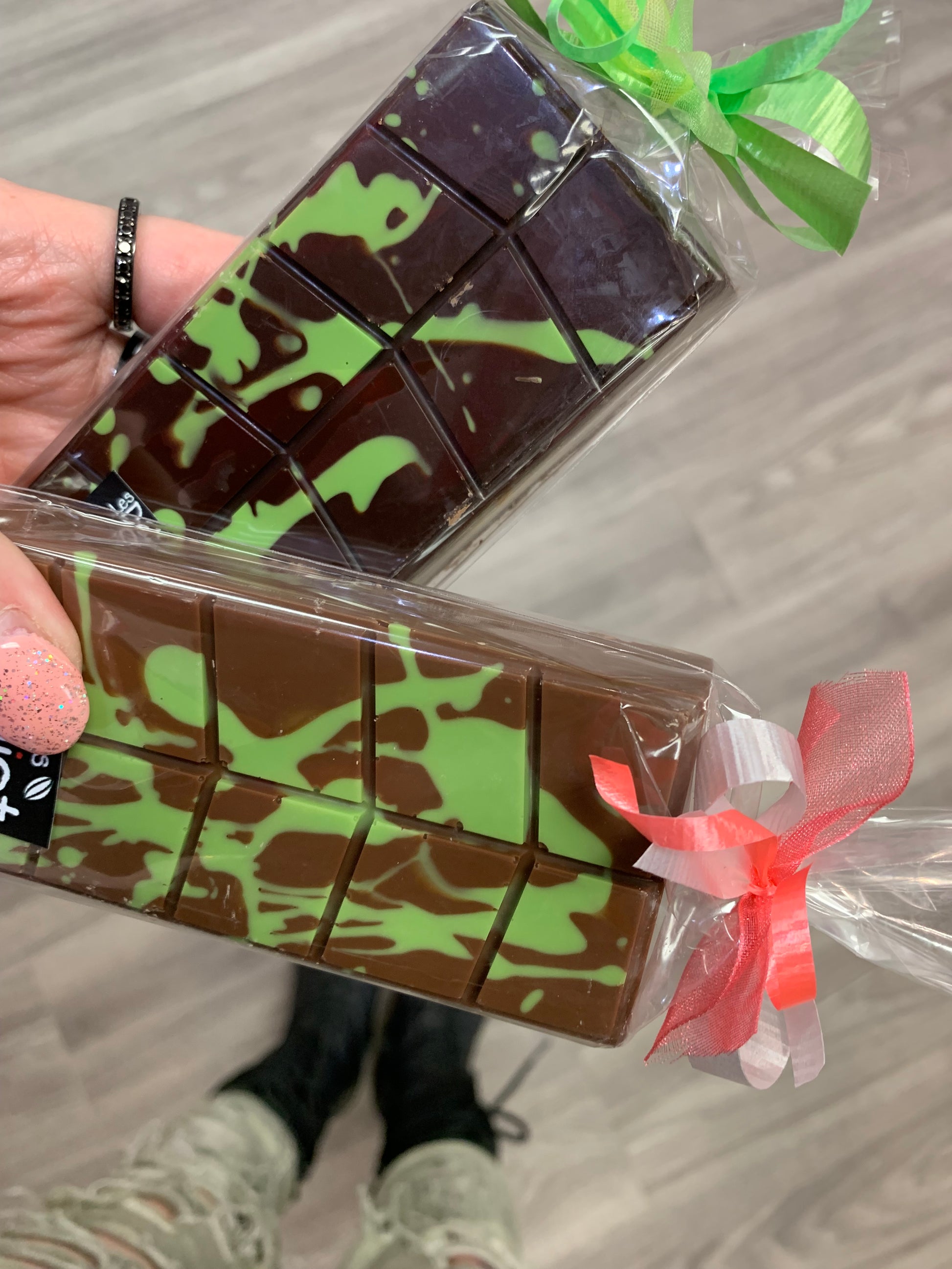 La fameuse barre de chocolat Dubai par une chocolaterie d’ici ! Un délicieux chocolat rempli d’une garniture à la pistache.