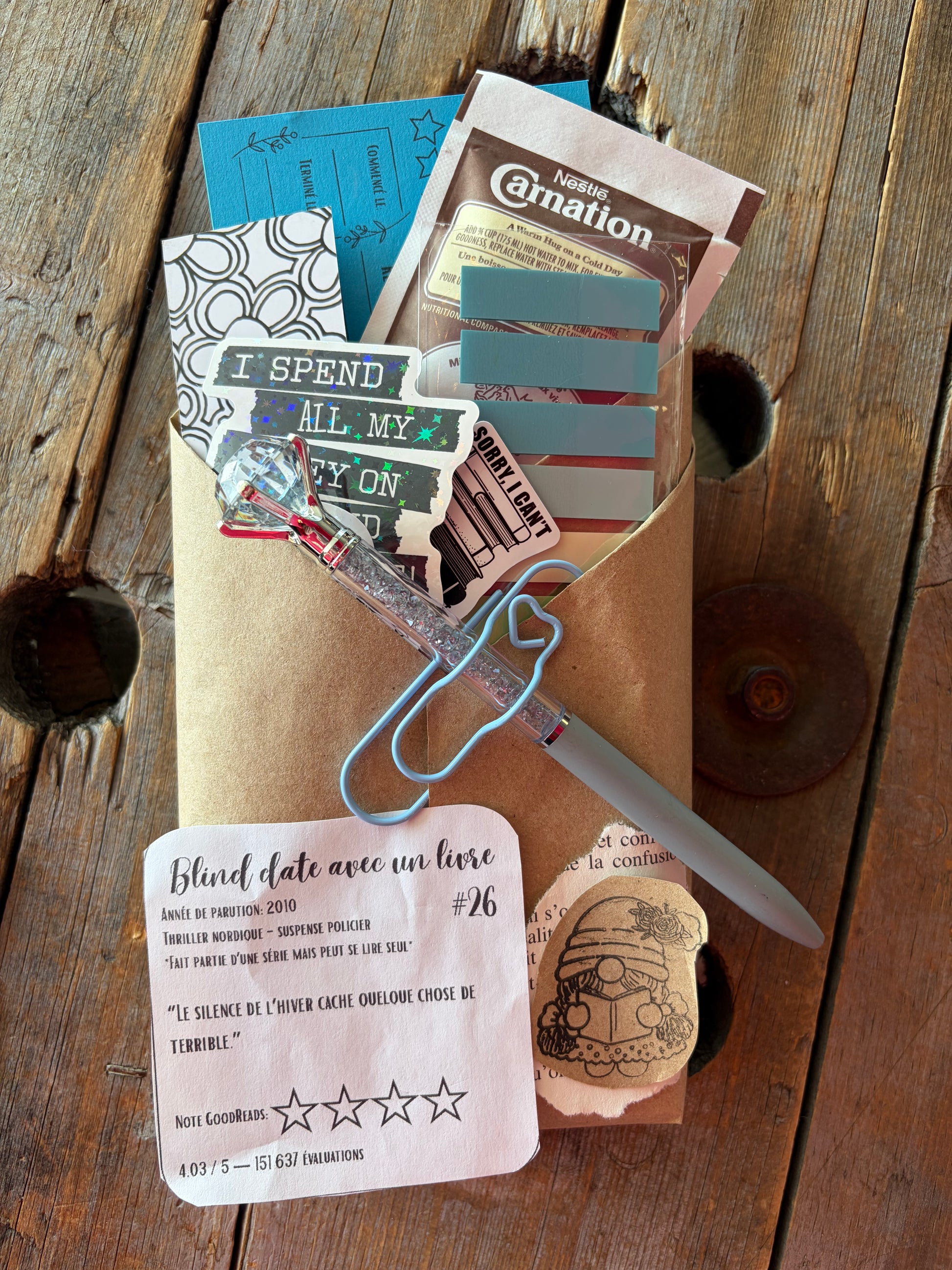 Chaque kit de Blind date vous permet de passer un bon moment en compagnie d’une agréable lecture. NOTEZ que les livres sont de seconde main mais en bon état! Ils peuvent tout de même montrer des traces d’un lecteur précédent, mais rien de flagrant.