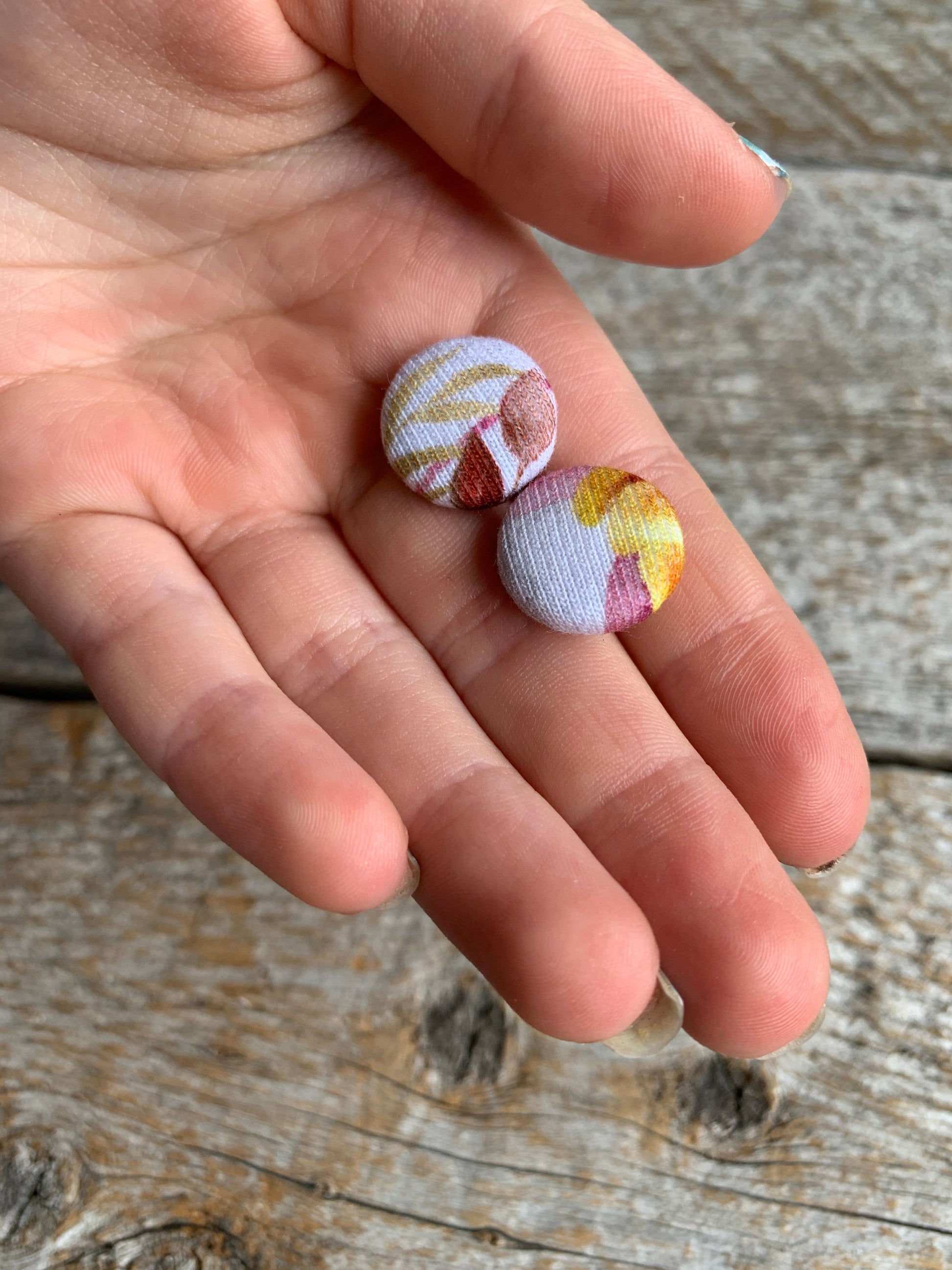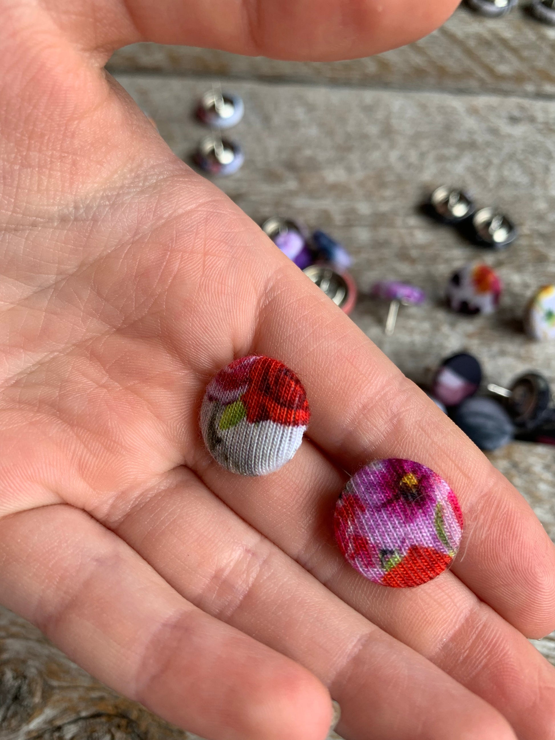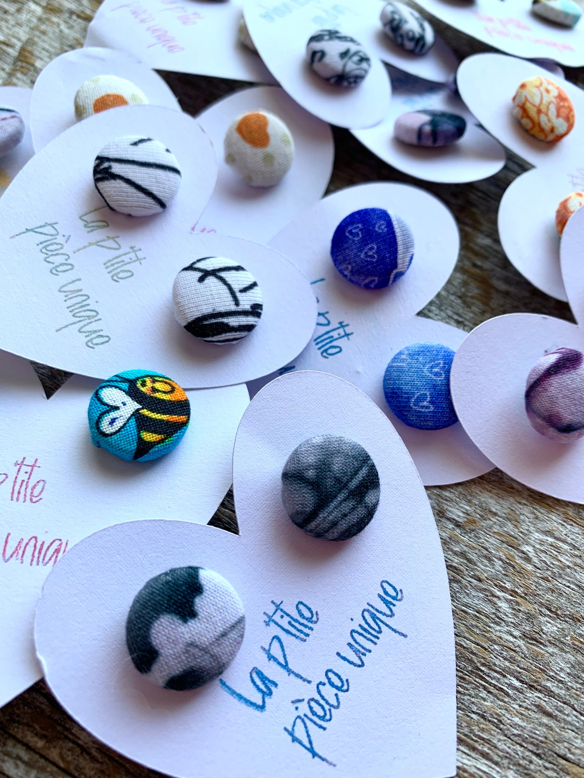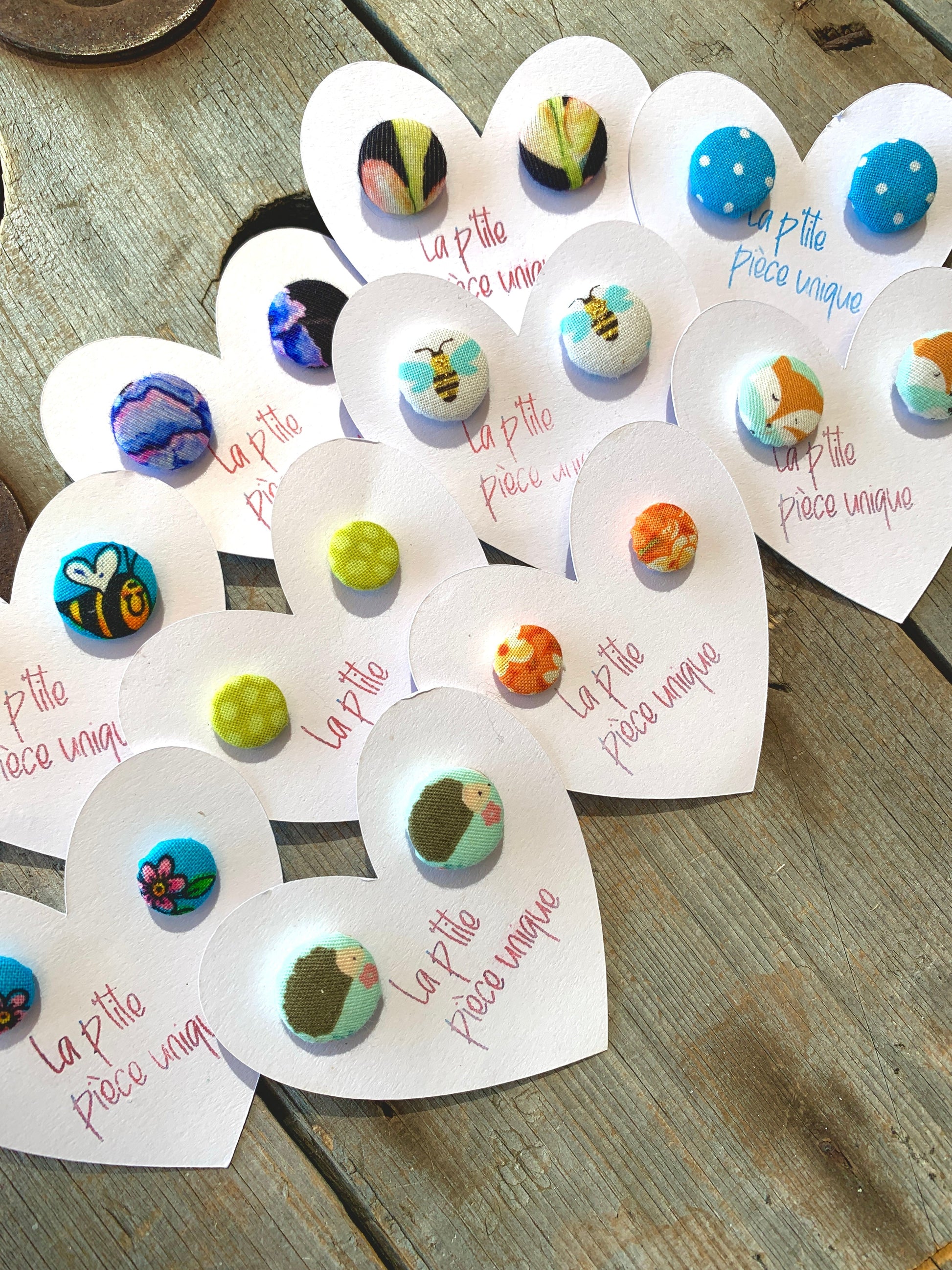 Boucles d’oreilles avec revêtement de tissu faites le plus souvent par Élya ou kyana avec l’aide de maman. Les tissus utilisés sont généralement des petites retailles, donc souvent les modèles sont uniques ou disponibles en petite quantité seulement.