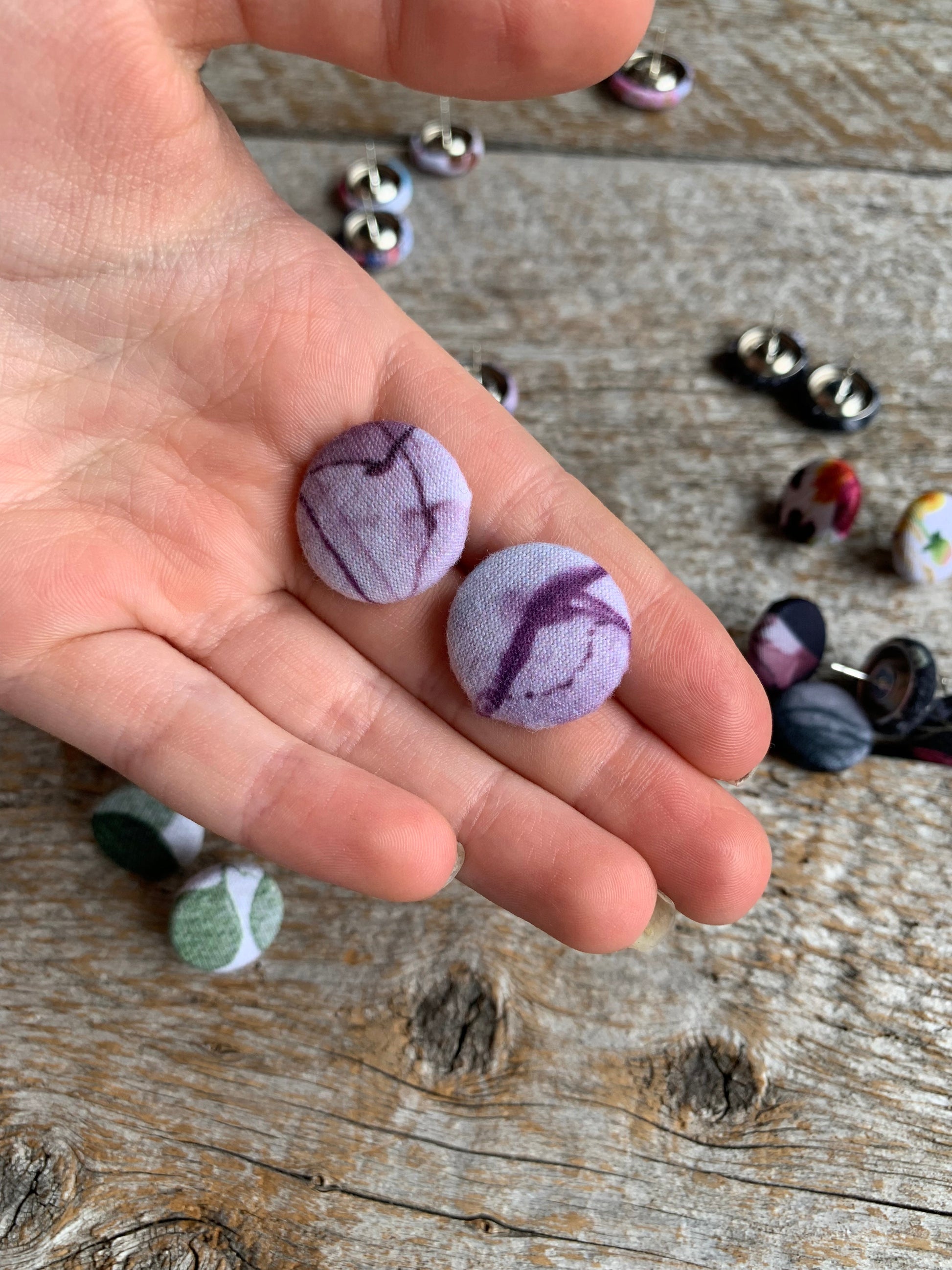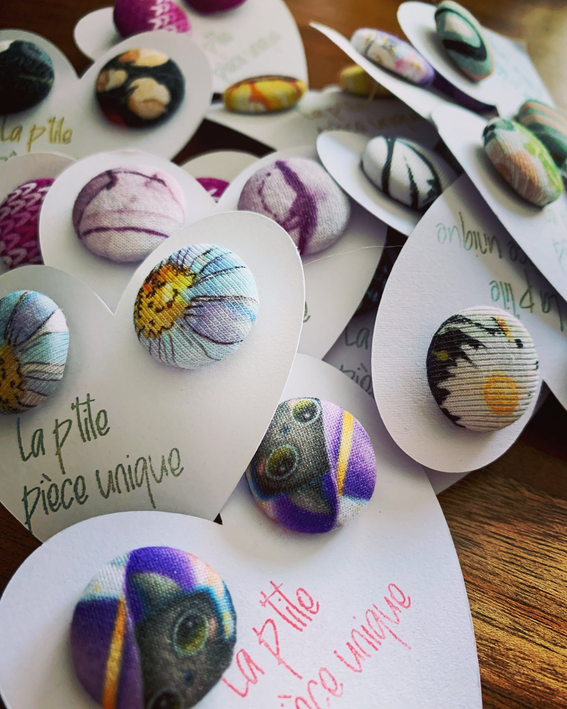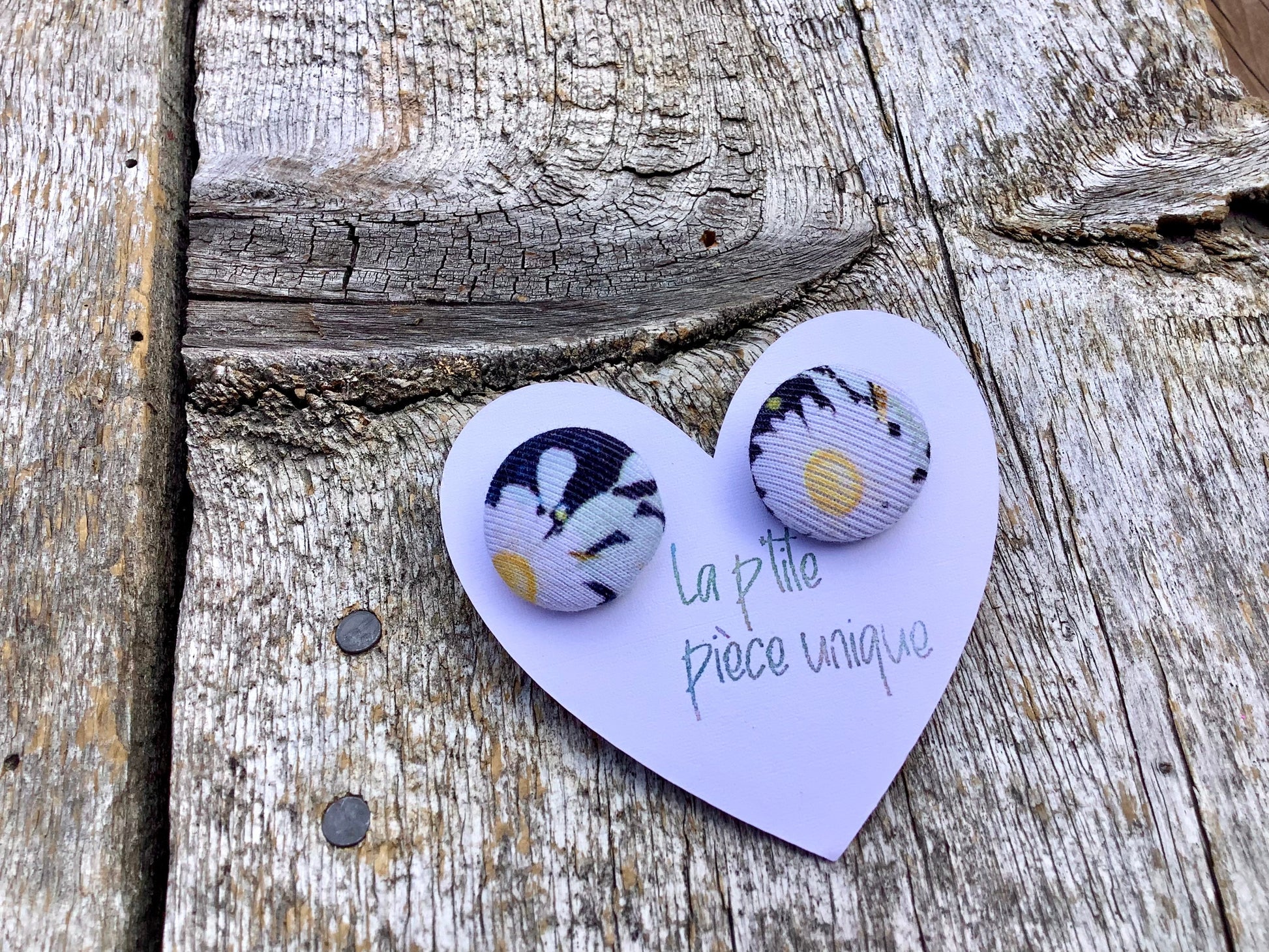 Boucles d’oreilles avec revêtement de tissu faites souvent par Élya ou Kyana, avec l’aide de maman . Les tissus utilisés sont généralement des petites retailles, donc souvent les modèles sont uniques ou disponibles en petite quantité seulement.