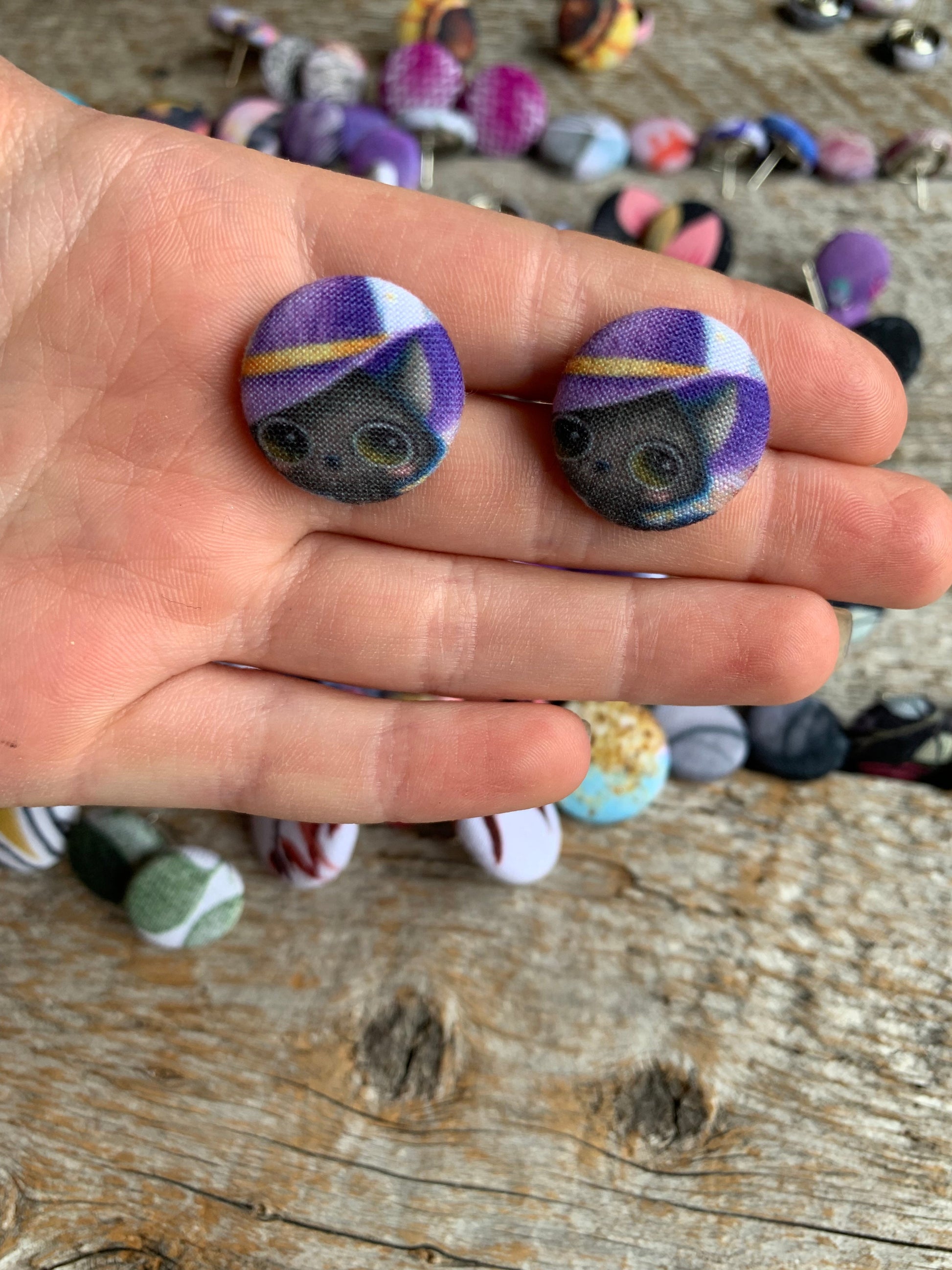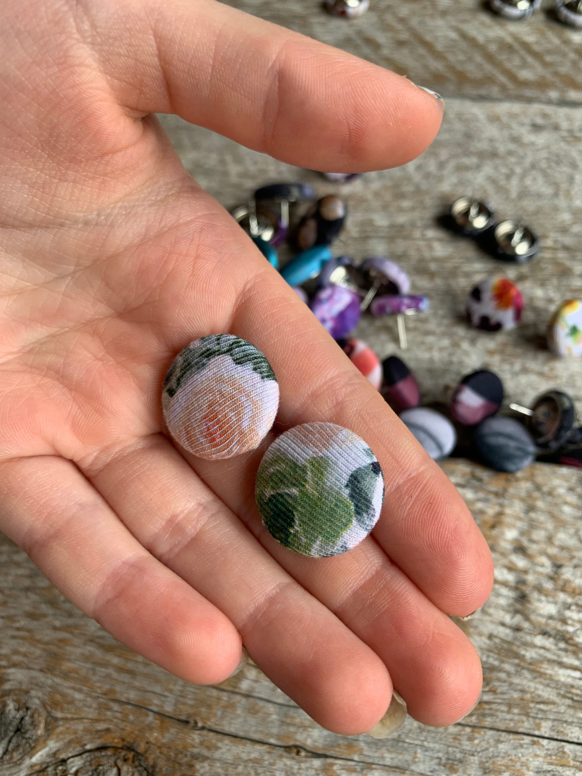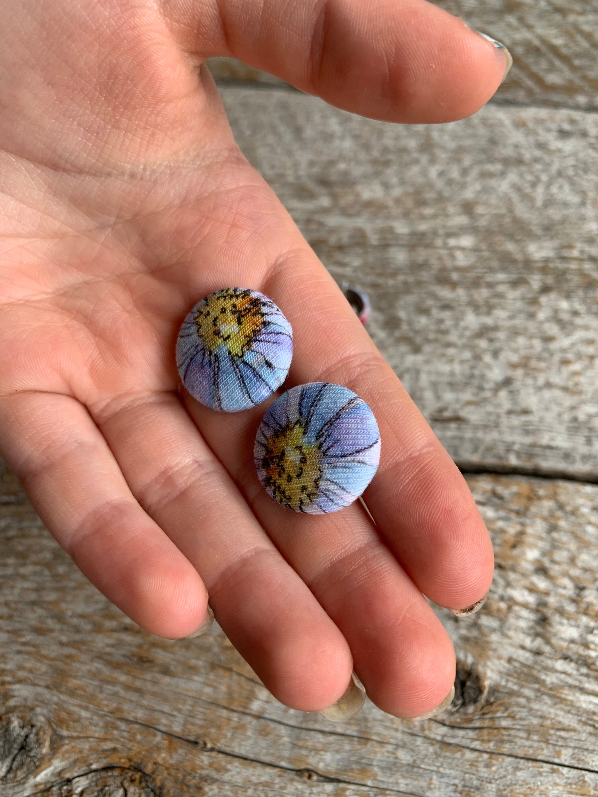 Boucles d’oreilles avec revêtement de tissu faites souvent par Élya ou Kyana, avec l’aide de maman . Les tissus utilisés sont généralement des petites retailles, donc souvent les modèles sont uniques ou disponibles en petite quantité seulement.