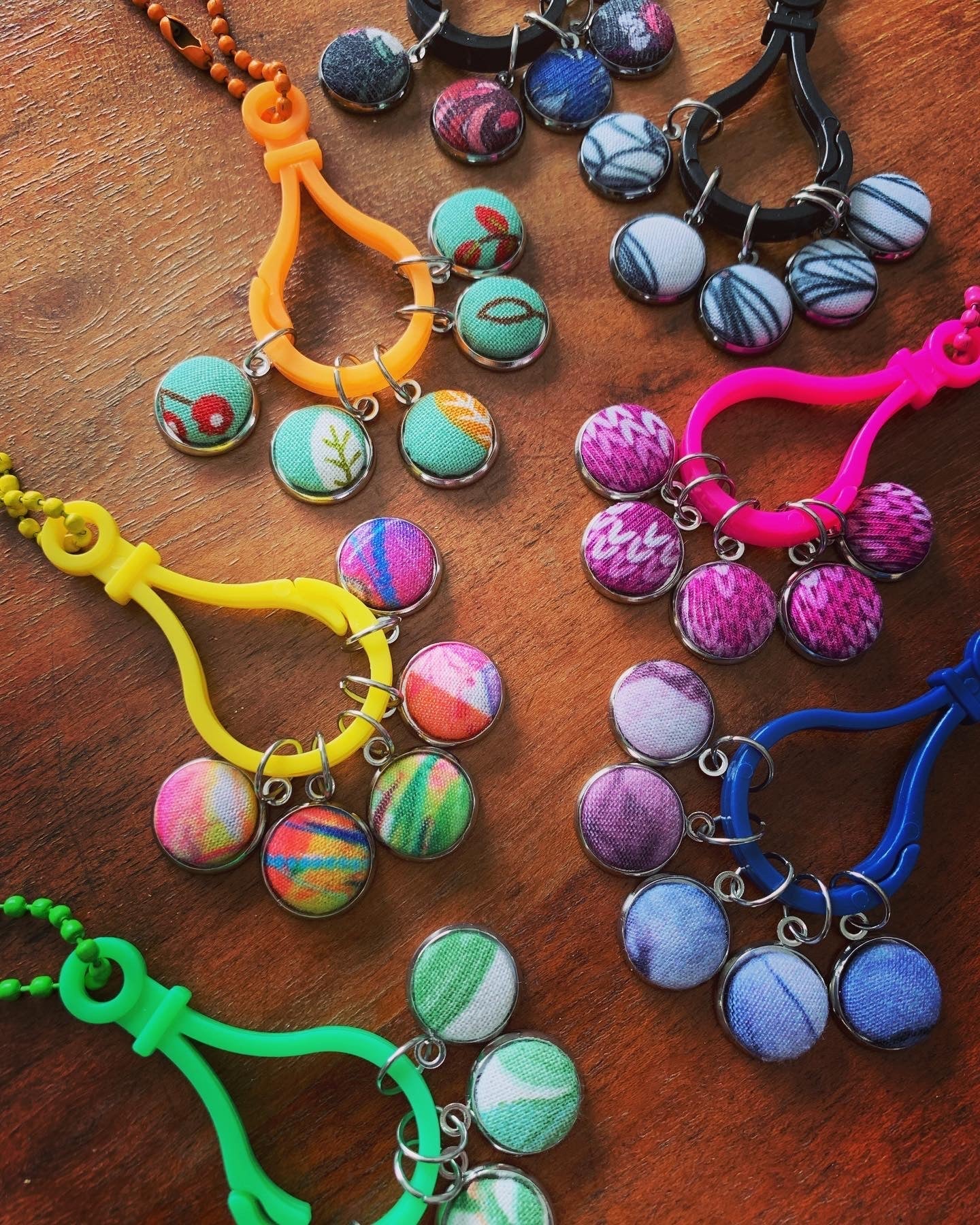 Chaque ensemble de 5 marqueurs est unique ; ils sont réalisé avec des retailles de tissu; même si j’ai suffisamment de tissu pour faire plus d’un ensemble, les coupes sont faites aléatoirement dans les motifs :)