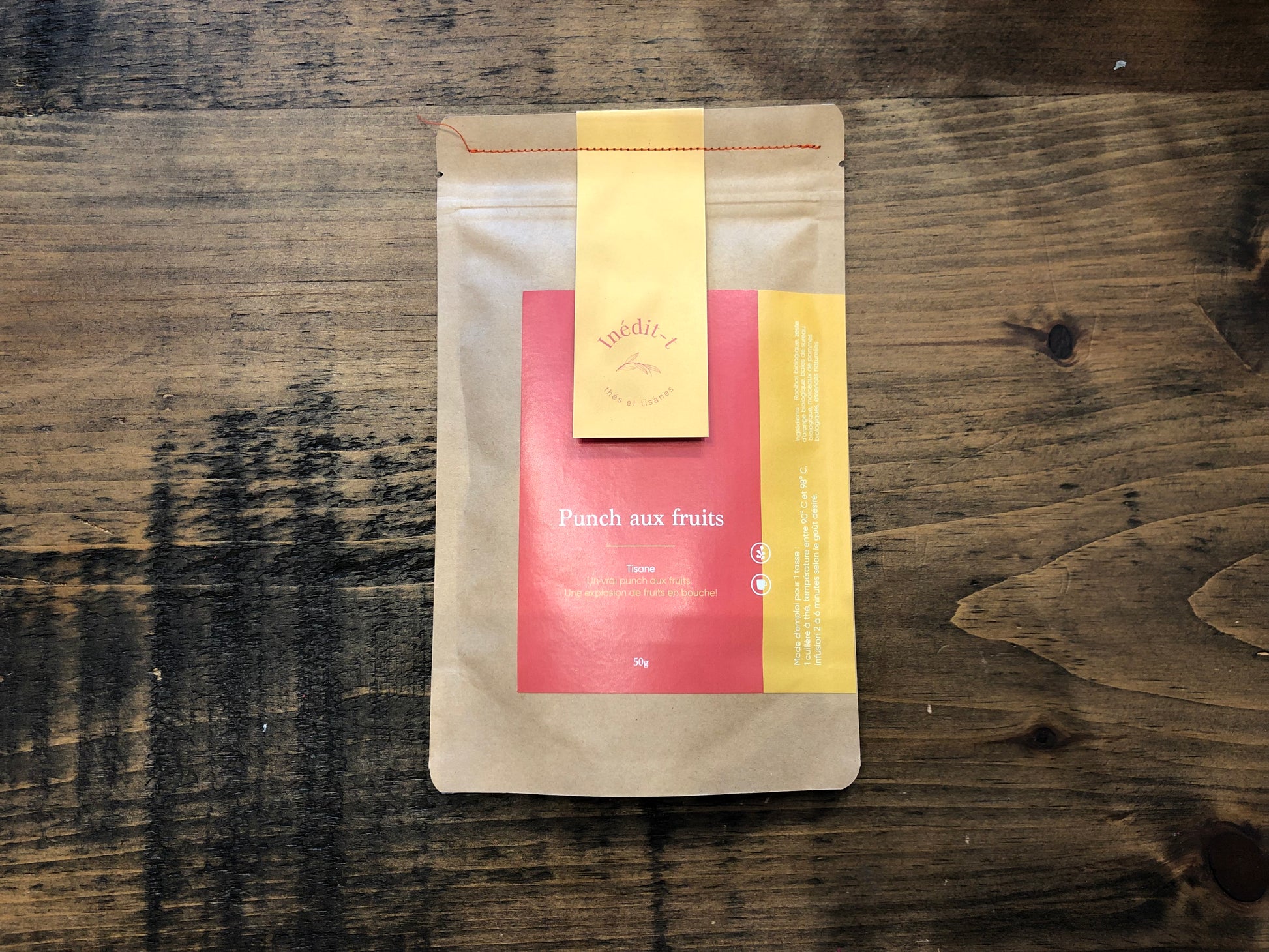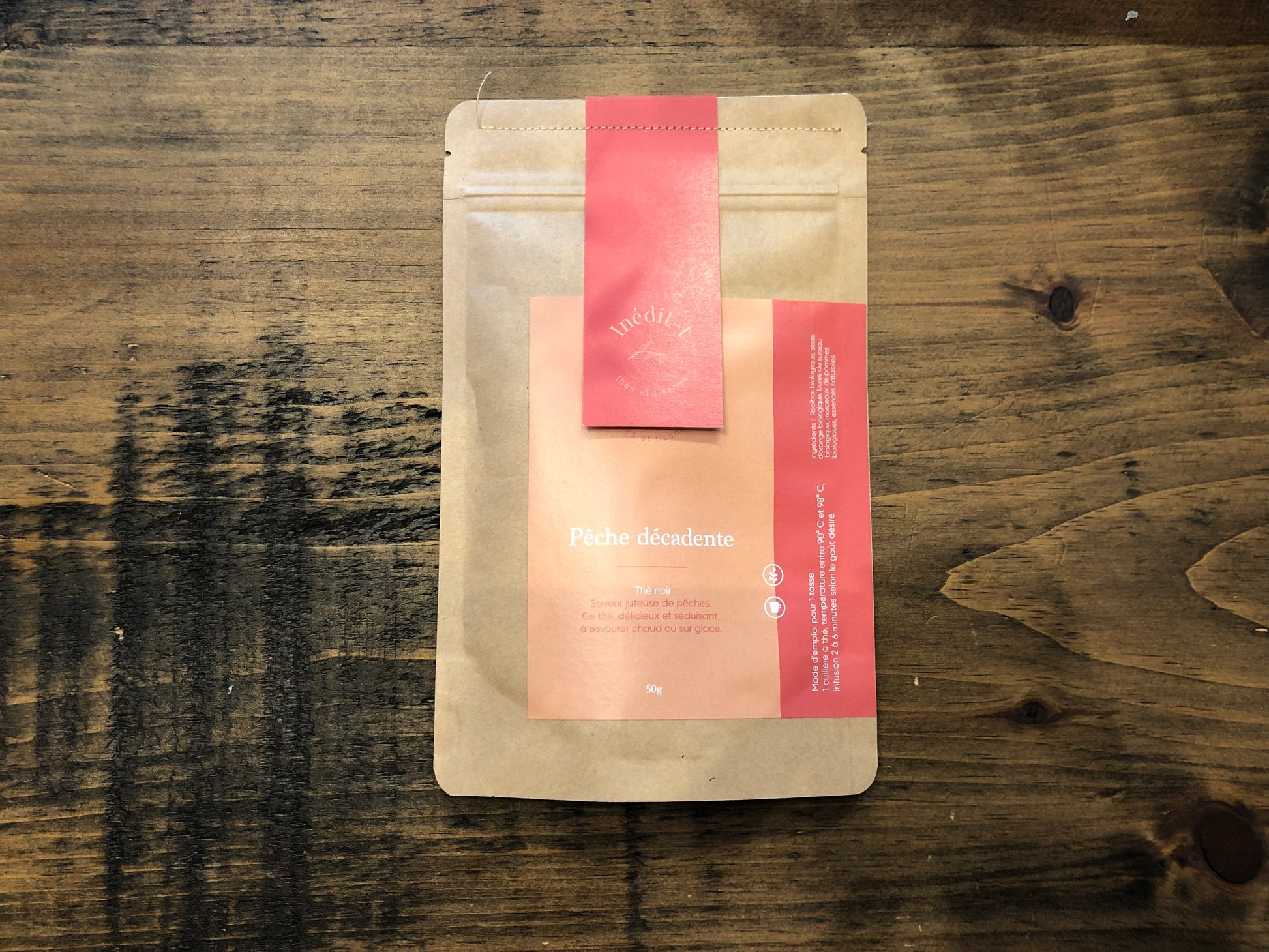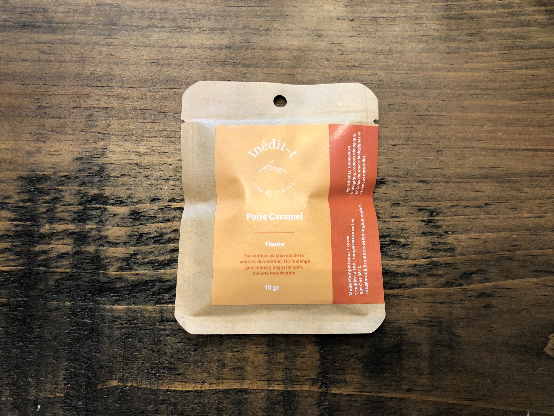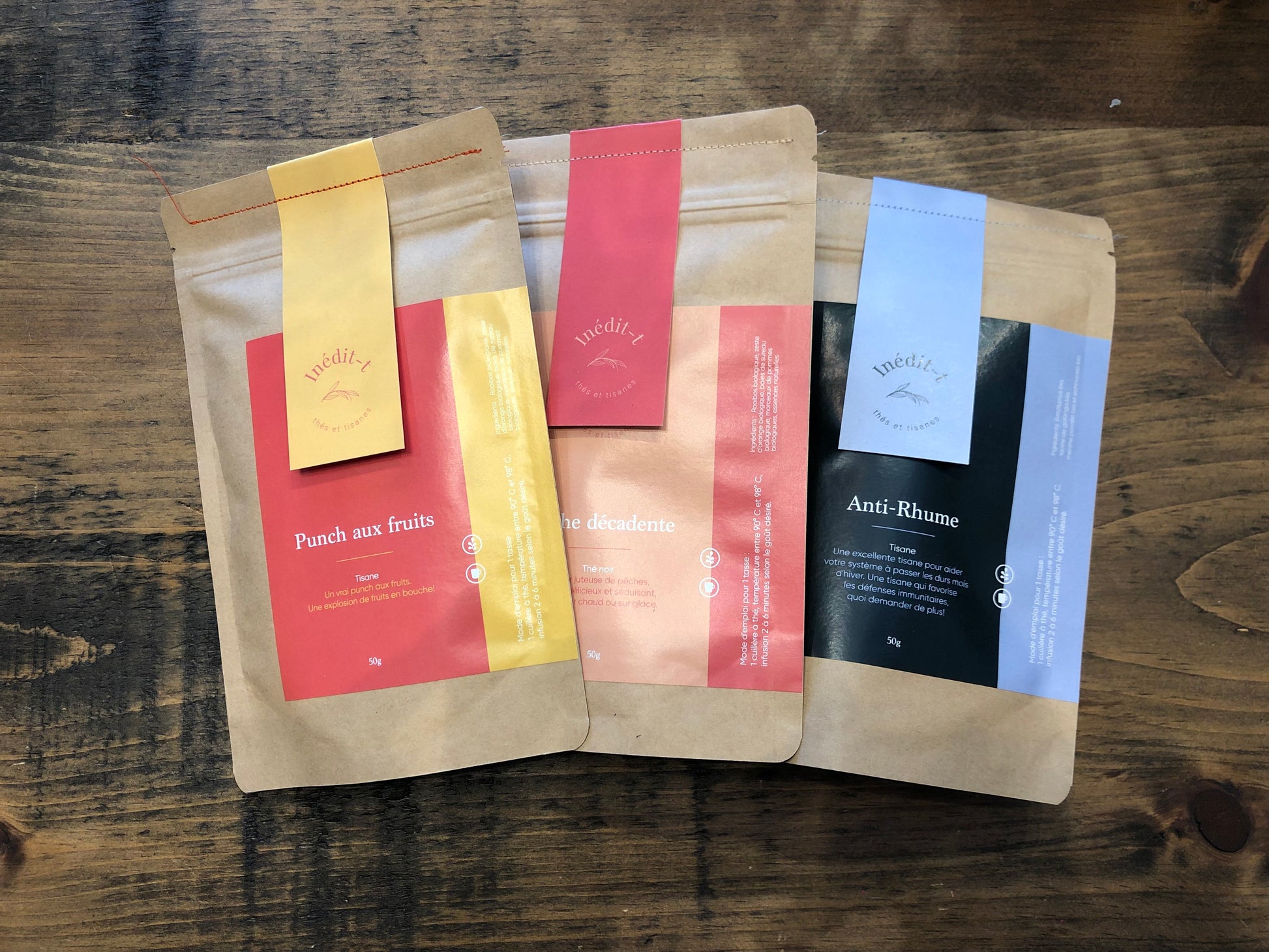 Sélection de thés et tisanes biologiques préparés au Québec par la compagnie Inédi-t. Chaque sac contient 50 gr.