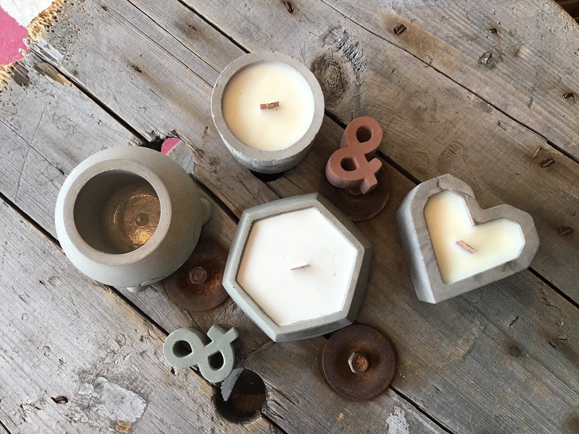Produits en béton fait à la main par &pür. Chandelles de soya, petits pots pour plantes (parfaits pour cactus et succulents) ainsi que d’autres décorations originales!